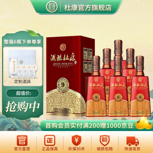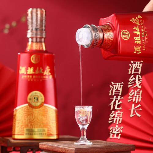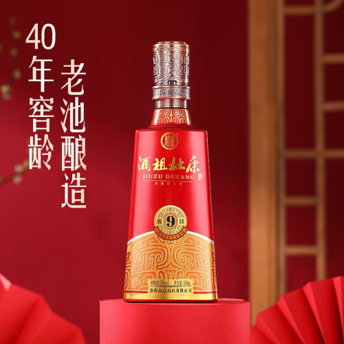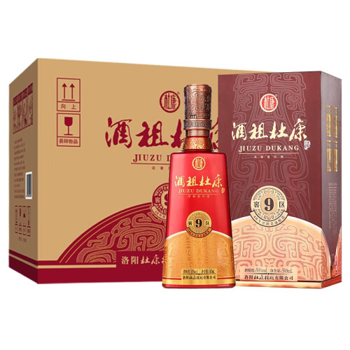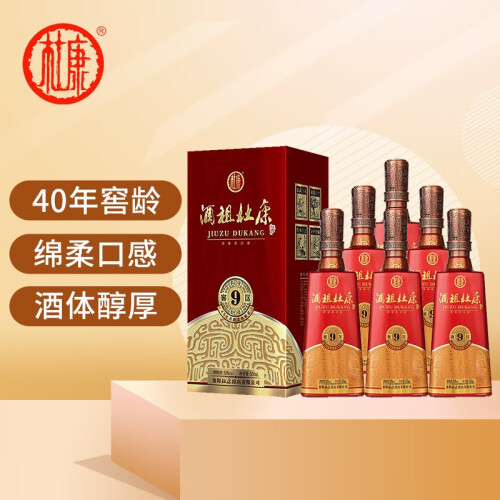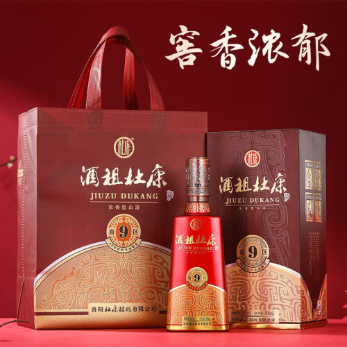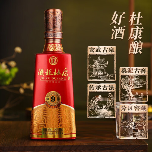 杜康9窖区窖龄40年是洛阳杜康控股有限公司出产的一款中端浓香型白酒。杜康酒是中国历史文化名酒,已有五千年历史,因酿酒鼻祖杜康始造而得名,有“进贡仙酒”之称。最有名的就是魏武帝曹操的“何以解忧?唯有杜康”的千古绝句。曾先后荣获国家质检总局“原产地标记注册”、“中华老字号”、“中国驰名商标”等荣誉称号。这款白酒采用带饕餮纹饰的复古瓶盖、大红色的喜庆编钟瓶身,瓶身正面拥有烫金工艺文字和图案。这款白酒选杜康酿酒遗址自然地理环境下所特有的高粱、小麦为主料制曲,秉承杜康始酿秫酒并世传千年的“三蒸三酿,五齐六法”、单粮固态发酵,用叉装甑、老五甑工艺、择时取酒、手工酿制、混蒸混烧、量质摘酒等古法技艺,老窖池酿造,分区窖藏。