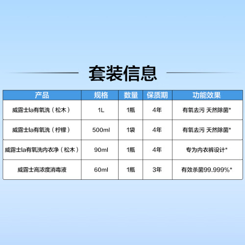 Walch威露士洗衣液套装包含:2瓶3升装6合1洗衣液、2瓶1.26升洗衣液、3瓶内衣净、3瓶消毒液。有氧洗除菌更强配方,除菌洁净一步到位。La有氧洗涤粒子,有氧配方释放去污力。威露士除菌成分,72h长效抑菌。天然植物萃取,洁净更温和。祛除霉味异味,闻得到的洁净清香。
