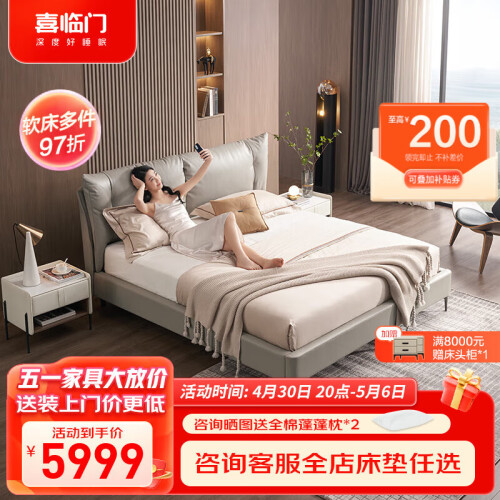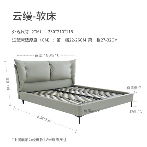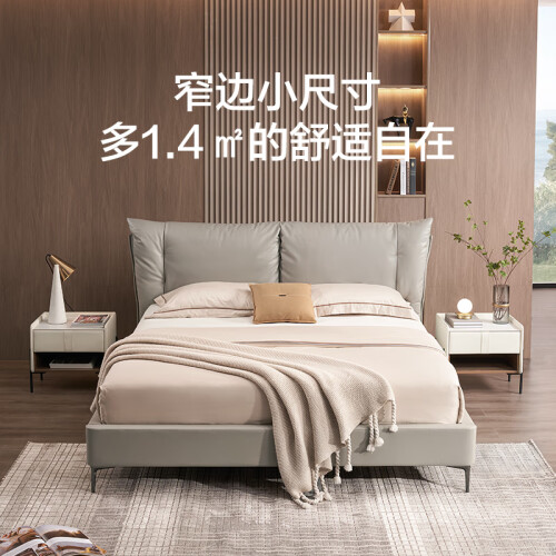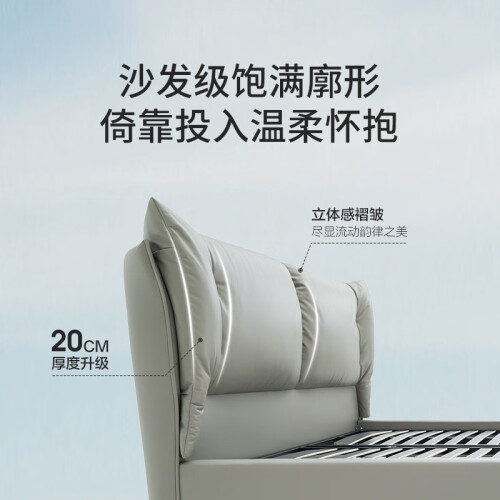 喜临门慵懒风卧室双人大床,云感舒适靠感,采用新西兰进口头层黄牛皮,柔滑细腻,亲肤透气,鹅毛+公仔棉填充靠包,更舒适,给人云柔舒适感,4.5cm小间距排骨架,承重更出色,还有2档排骨架深度可调,适配床垫更广泛,15cm高抬脚设计,给扫地机器人预留出充足空间进出自如,清扫房间,减少床底积灰。