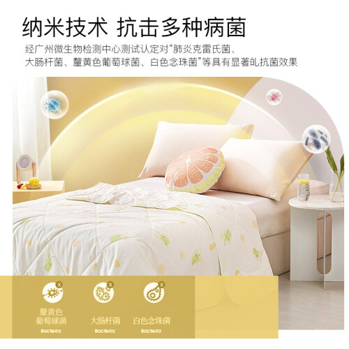 超柔面料,柔软细腻,手感绵柔,舒适亲肤,理想的睡眠环境。经广州微生物检测中心测试认定对“肺炎克雷氏菌、 大肠杆菌、釐黄色葡萄球菌、白色念珠菌”等具有显著的抗菌效果。选用环保印染工艺,图案自然灵动,色牢度高,久洗如新。