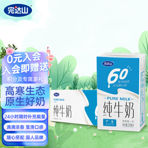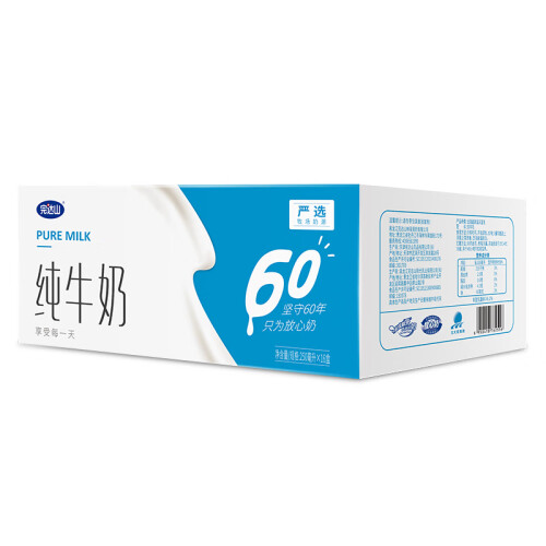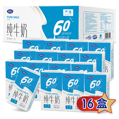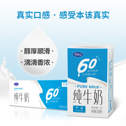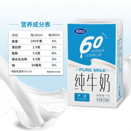 完达山是国内著名的乳制品企业,完达山奶源基地19项国家生态指针达标率100%,被国家绿色食品管理中心认定为绿色食品乳品生产基地。奶牛天然牧场饲养。这款牛奶蛋白质含量2.9g/100ml,口感醇厚,味道香浓。规格250ml*16盒。