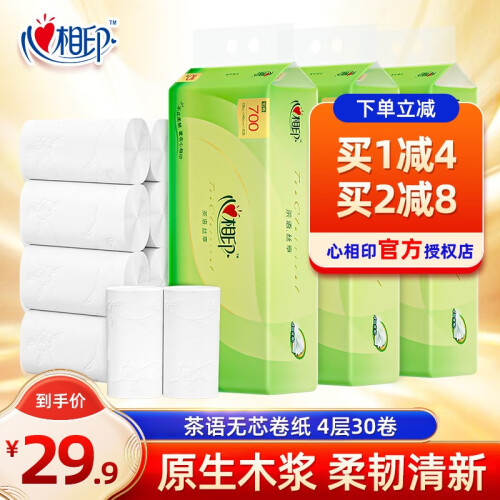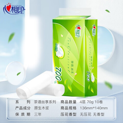 心相印 茶语丝享系列 自然无香无芯卷纸,精选进口原生木浆严格去菌把控,不含可迁移荧光增白剂,完全无添加健康安全。无边界茶叶压花,安全细腻加倍且紧实不易分层。长短纤维科学配比,吸水快速更柔韧,洁净卫生。4层柔厚,柔韧耐撕不易掉屑且亲肤,强湿水不易破。自然无香的纸张内涵,纯粹本真。