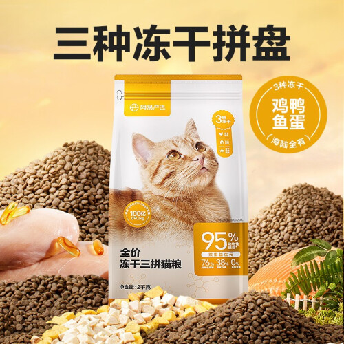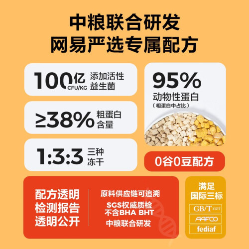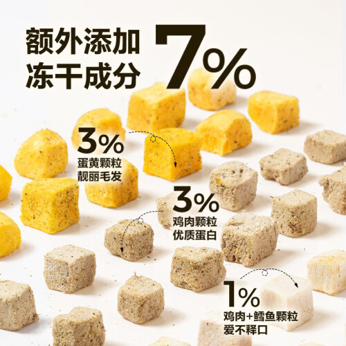 本款全价冻干三拼猫粮新升级,三种冻干拼盘,海陆全有鸡鸭鱼蛋,38%以上粗蛋白含量,95%动物性蛋白,含肉量占比66%,性价比扛把子,更长肉肉,营养丰富,给予猫咪充足的成长能量补充。额外添加7%冻干成分,3%蛋黄颗粒,靓丽毛发,3%鸡肉颗粒,优质蛋白,1%鸡肉鳕鱼颗粒,让猫猫爱不释口。添加100亿活性益生菌,保护猫咪肠胃,促进消化吸收。