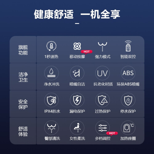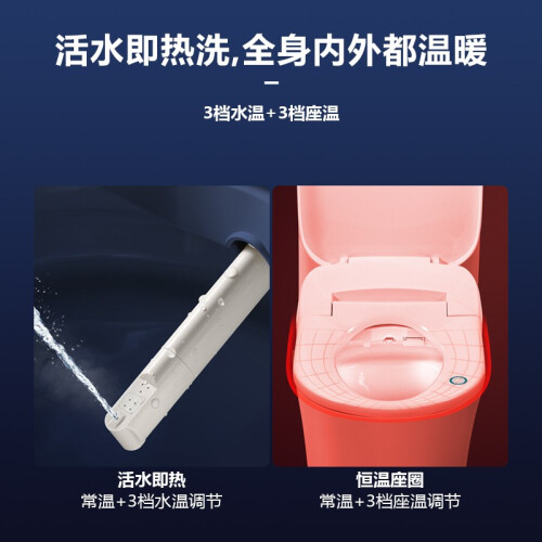 臀部洗净+移动清洗,空气混合清洗,力度柔和舒适。女性冲洗+移动清洗,绵密4孔水流,呵护女性私处键康。加热式座圈,坐感舒适温暖全包围。常温+3档座温调节,加宽3D式座圈舒适贴合臀部,将温暖传递到整个臀部,着坐舒适。