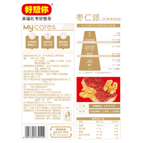 软糯甜润红枣,大颗酥脆核桃,口吃到双重营养美味!为你省去吃枣吐核、吃核桃剥壳的烦恼。1+1的双倍快乐,精心配比好吃更是实力派。规格:198g*2袋。
