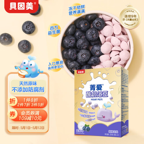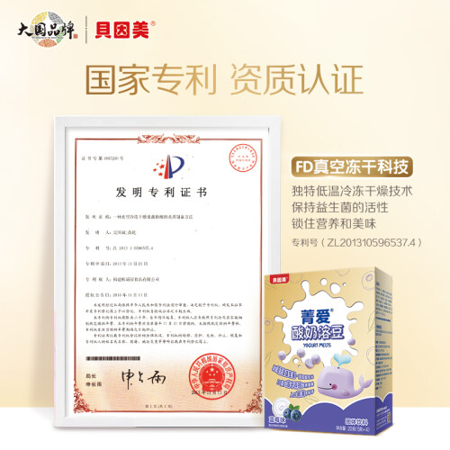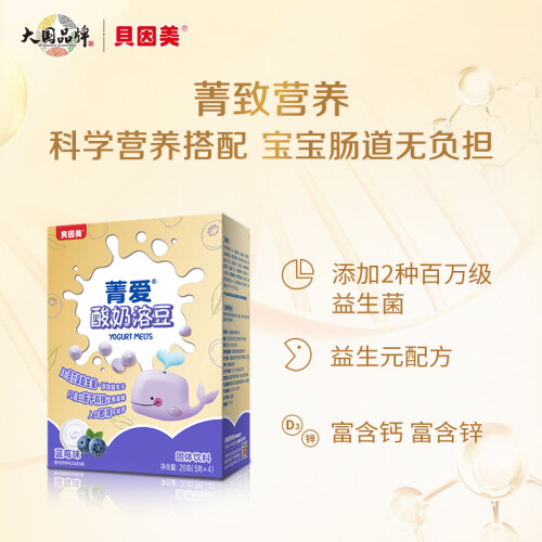 贝因美以“关爱生命,热爱生活”为宗旨,以0-12岁婴童为服务对象,全方位拓展婴幼儿食品、婴童用品共计100多个品种,婴幼儿食品主要有奶粉、辅食、营养品三大类。这款菁爱系列 酸奶溶豆采用FD冻干技术,保留酸奶营养和美味,入口即溶,宝宝好吞咽,避免呛噎,富含钙和锌,有助于改善食欲,添加益生菌和益生元,有利于调节肠道菌群,助力消化吸收,不添加香精、色素、防腐剂等,宝宝食用安心,造型小巧易拿捏,锻炼宝宝抓握能力。