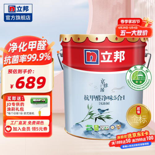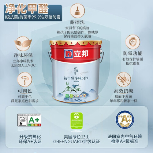 此款有效抵抗金黄色葡萄球菌和大肠杆菌,有效预防潮湿地区霉菌生长,高效抗碱,墙面不发黄,可调千色,满足家庭色彩需求,耐擦洗,产品规格18L,约可涂刷108m2。