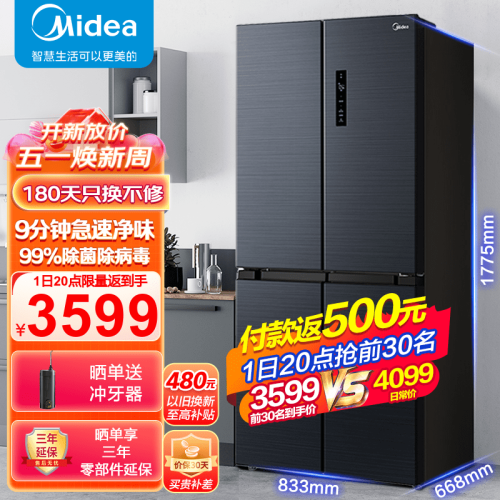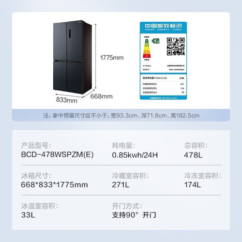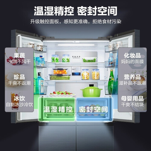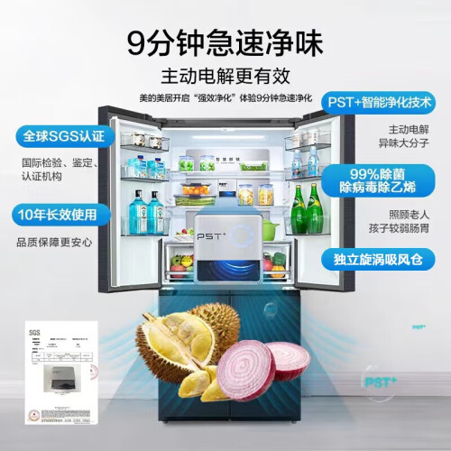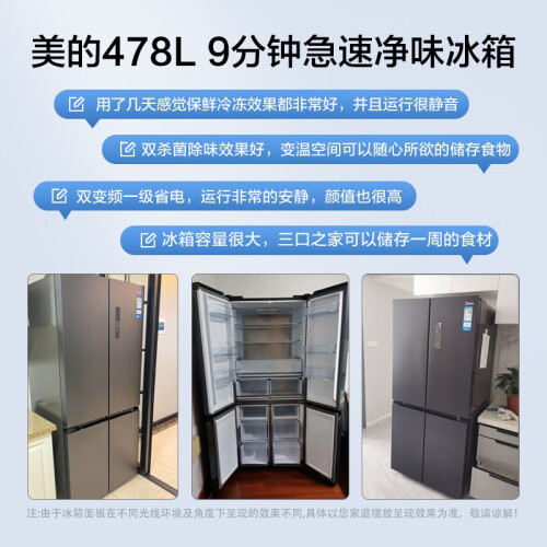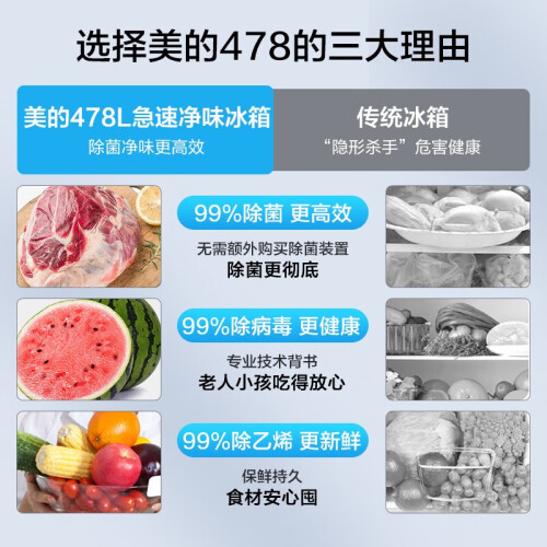 美的(Midea)这款型号为BCD-478WSPZM(E)d的十字对开门冰箱,其属于净味系列,采用了十字对开门设计,内膛容量高达478L升,温湿度由档位调节升级为触控面板调节,电脑控温更准确;增加温湿度传感器,对箱内温湿度感知更精准;温湿度调节二合一,同时调节,食材更保鲜。99%主动除菌除病毒净化给家人健康多一层保护超磁感离子电场释放大量活性离子,主动歼火细菌病毒,除菌率高达99%,除病毒高达99%,时刻守护全家人的健康。