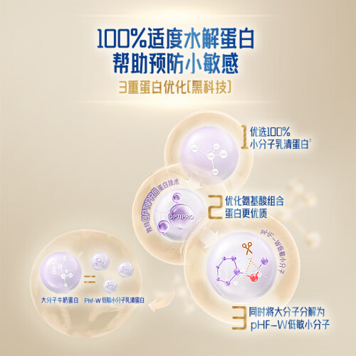 三重优化乳清蛋白小分子蛋白,适度水解工艺,高质量优化氨基酸模式,添加活性probiotic益生菌,促进肠道菌群平衡,建立肠道微生态,贴合人体,帮助宝宝更好消化。