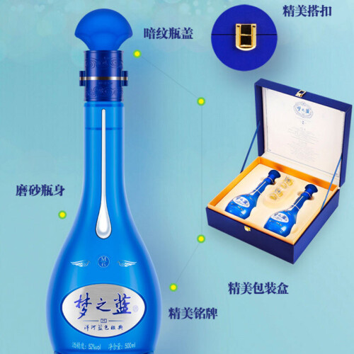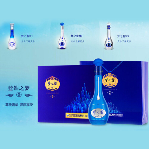 洋河梦之蓝是洋河蓝色经典系列中的高档产品,洋河酒厂作为中国第三大白酒品牌,蓝色经典系列酒实际也是其主打产品。其分有M1、M3、M6、M9和手工班五个档次,数字越大档次越高。M6是洋河酒厂之前的高端产品,色彩内敛与稳重的盒子设计,幽雅而不失动感的内置瓶子设计,尽显“蓝钻之梦”的寓意。 采用多粮型酿造技术,在北纬33度酿酒黄金带,酿酒生态环境得天独厚,粮曲香突出,窖香、糟香、醇香、蜜香协调其中,其窖香是江淮浓香带有一丝水沟气息的窖香。入口柔和,尾味偏甜。整体香气饱满而易饮。