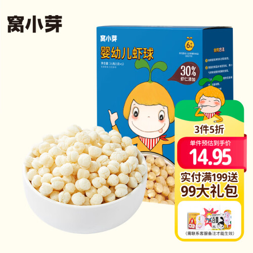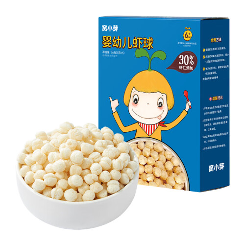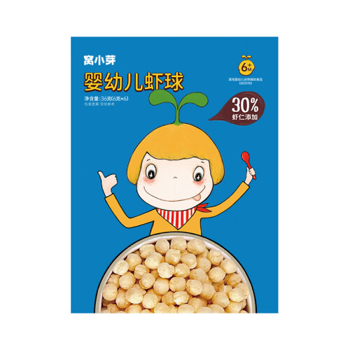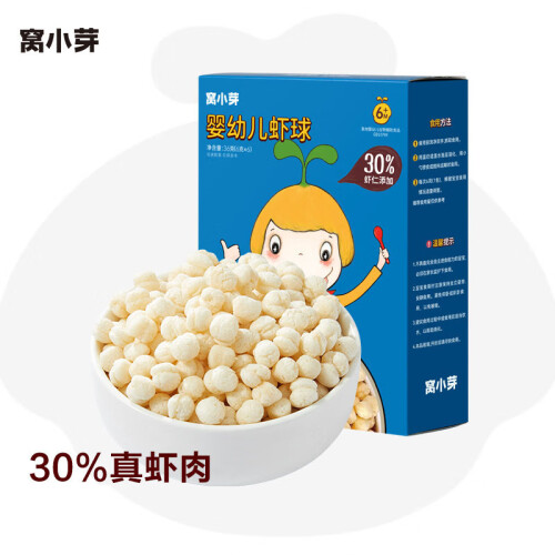 此款窝小芽 婴幼儿高钙虾球含30%虾肉,强化钙、维生素B1,培养宝宝自主进食,锻炼抓取,安全不卡喉,非油炸工艺。