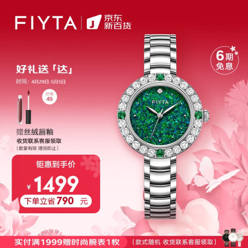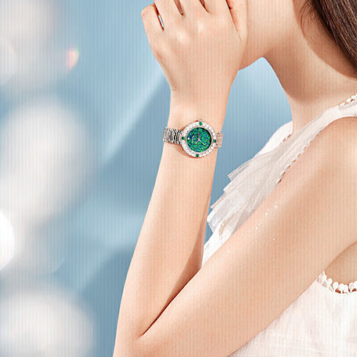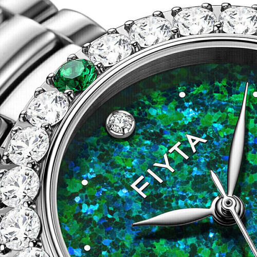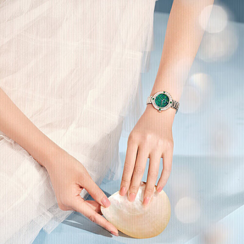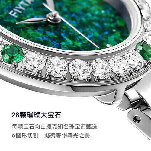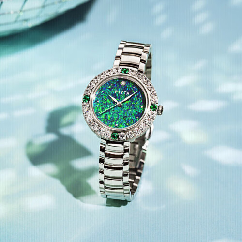 FIYTA 飞亚达 倾城系列 女士石英表 L865011.WNWD,此款腕表公价2,480元,灵感源于美人鱼寻宝童话,融汇宝石及珠宝几何切割工艺,以夏日海洋清凉色调,探寻人鱼少女的美好追求,直径3mm璀璨大宝石,28颗精致镶嵌于表圈,洋溢珠宝闪耀魅力,挥酒之间,光芒万丈,每颗宝石均由捷克知名珠宝商甄选,以a圆形切割工艺加工而成,火彩、璀璨、闪光,达至均衡比例,呈现星辰光彩,表盘由欧珀石熔结而成,交织大海和水藻的蓝绿双色,带给你独特又灵动的美感,一见即倾心,浪花表带,美妙依然,表带带粒如浪花层层推动,12mm纤细表带宽度,服贴女性柔美手腕,时间遐想,尽在腕间,品牌标志篆刻,精钢压底,尽显精工质感。