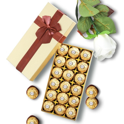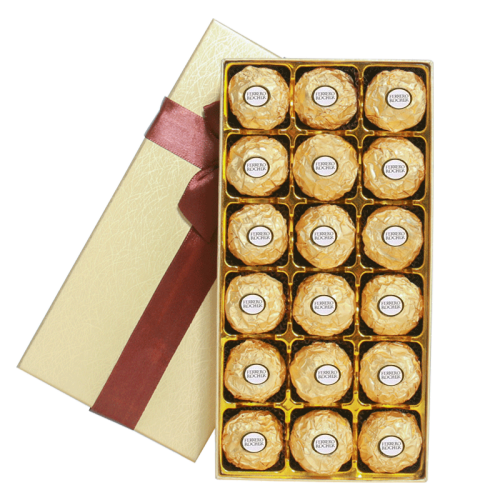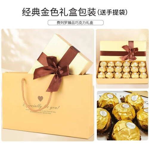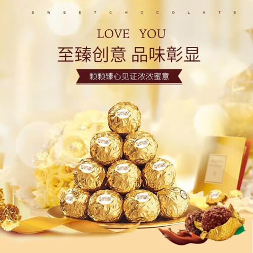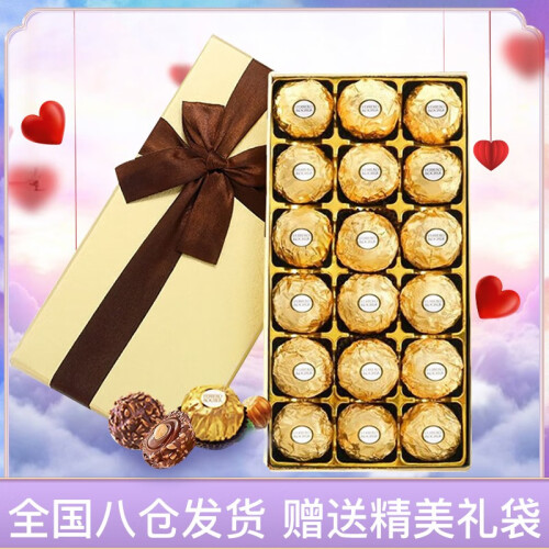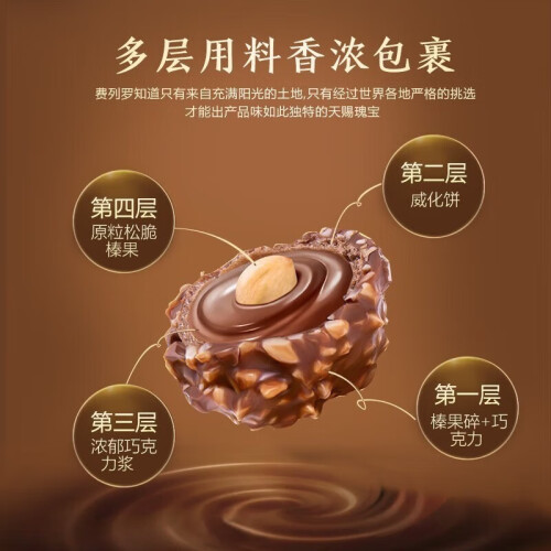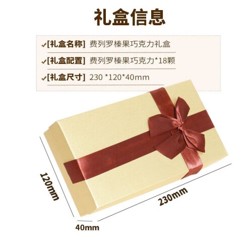 FERRERO ROCHER是费列罗集团旗下享誉全球的巧克力品牌。这款巧克力礼盒装内置有费列罗榛果威化巧克力18颗,巧克力采用多层式用料,外面铺满牛奶巧克力和碎榛子,内有松脆威化、香滑榛果可可酱和原粒榛果;外壳酥脆,咬开后里面是巧克力仁,口感细腻香滑富有层次感。巧克力采用金箔纸包裹,方便食用。