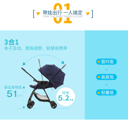 51CM高景观座驾,远离汽车尾气;170度大躺角随心调节,可坐可躺,轻松出行。四轮避震,独立脚刹。原生材料,注塑工艺,结实稳固,环保耐用。配备新生儿坐垫,幼儿优选。