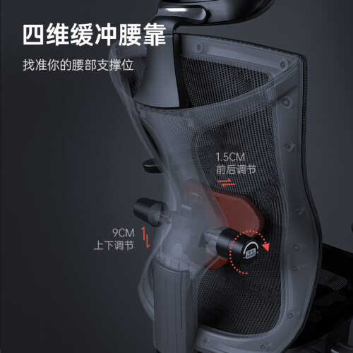 仿生靠背曲面;合理分散脊椎压力,腰靠部分可上下90mm/前后15mm灵活调节,更好减少久坐不适