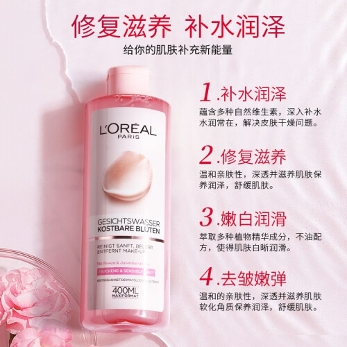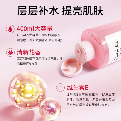 含玫瑰花可舒缓肌肤,茉莉花具有保护与补水效果,维生素E抗氧化,收缩毛孔,延缓皮肤衰老,温和亲肤,保湿滋养肌肤,使肌肤细嫩白皙~