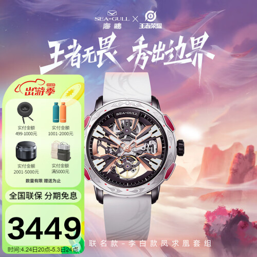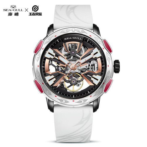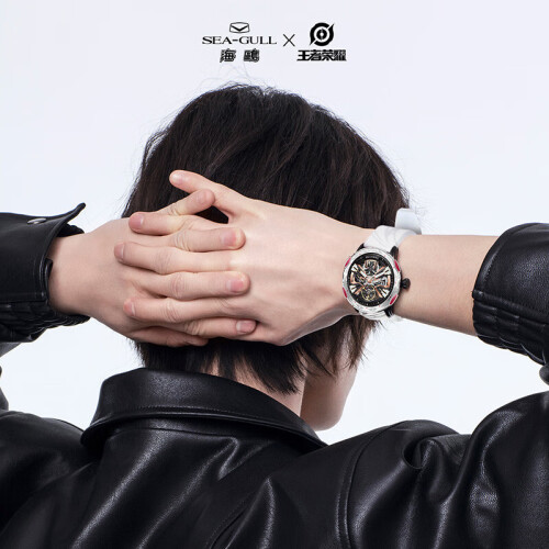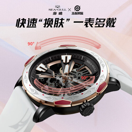 SEA-GULL 海鸥 x 王者荣耀 男士自动机械表 (边界·李白-凤求凰款) 215.97.1125HK,该产品的寓意中以浩瀚宇宙中,时间无界海鸥表以机械寻找其中的规律,雕刻属于中国的时间脉络,时间长河里,文明不朽,王者荣耀用数据和代码,为当代人与中华文化,架起一座沟通的桥梁。这一次,海鸥表联合王者荣耀匠心国表与经典手游,初次破次元联动,用中国缜密制造领域的瑰宝,讲述当代中国人的生活方式,突破边界,勇敢前行。非凡搭档带你一路躺赢,时尚硅胶表带,触感轻盈柔软,弧度设计更贴合手腕。