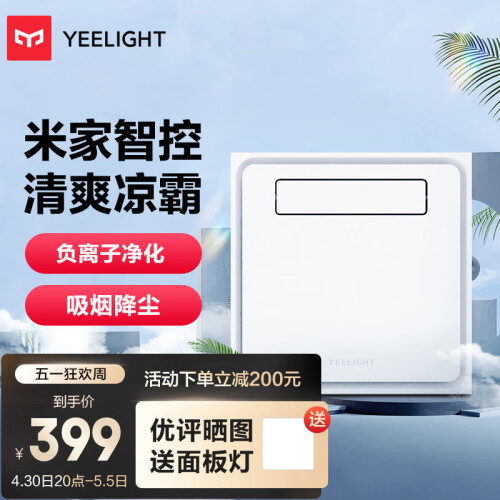Yeelight 智能凉霸 ,急速出风,强劲风量,120风向可调,带动厨房中空气流动,大风量带来习习凉意。简约设计,气质非凡。尺寸为30*30cm,安装后顶部与吊顶齐平,节省空间。