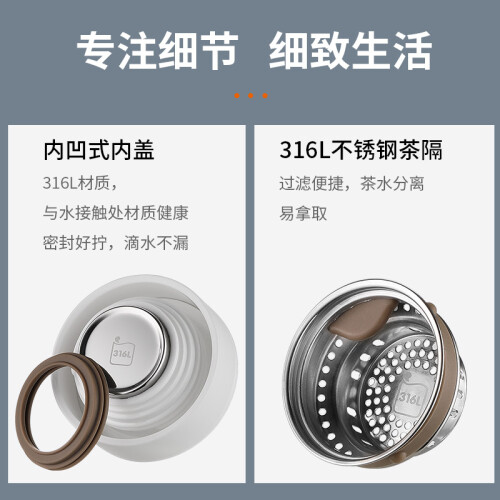 打破单调颜值百搭,商务3色,展现简约气质,不锈钢,耐磨耐用耐腐蚀,纯净材质,坚守品质,不易生锈,不与液体发生化学反应,使水质纯净,健康无害,双层真空,隔绝温度流失,无尾抽真空技术,内胆镀铜提升保温性能。