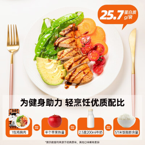 肌肉小王子(MUSCLE PRINCE)的这款混合口味健身餐组合装,内含鸡胸肉、鸡肉丸两款。采用无油嫩蒸的方式,热量低的同时使鸡肉鲜香入味。鸡胸肉紧实弹牙,柔韧有嚼劲;鸡肉丸口感细腻,软糯弹爽。袋装内设独立小包装,小巧便携,干净卫生。保质期180天,建议置于阴凉干燥处储存。