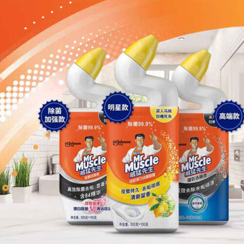 Mr.Muscle威猛先生和雷达、碧丽珠同属于美国庄臣旗下的品牌。这款清洁套装可有效清洁马桶内的污垢,使用后会留有淡淡的柠檬草的清香,带导向式喷嘴,使用更方便,使用时将液体均匀喷洒在马桶内部四周,使洁厕液沿马桶壁流下,再用刷子轻刷,用水冲净即可。