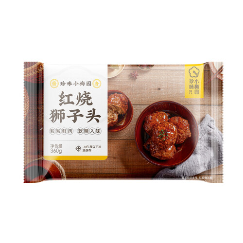 珍味小梅园是上海餐餐乐食品科技有限公司旗下品牌,2019年注册商标。自成立以来,公司致力于RTC/RTH半成品菜的研发、制作和零售以“将餐厅级美味搬进消费者的冰箱”为核心理念,推出近100+款有颜、有料、有味、有效的预制菜品,帮助厨房小白从繁杂的做菜步骤中解放出来,消除“做饭焦虑”。该款红烧狮子头甄选肥瘦相间的猪前腿肉,细剁成馅,多种香辛料滚揉入味,再经先炸后炖工艺定型熟制,肉丸表皮金黄诱人,久煮不散。搭配秘制红烧汁调味,入口软糯鲜嫩,酱香味浓,鲜甜咸香,外酥里嫩,汤汁拌饭绝配。规格:360g。