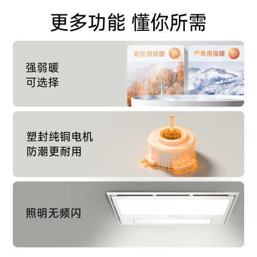 设计简约,不挑装修风格,采用平嵌设计,与吊顶更贴合,适合大小卫生间,美观自然。