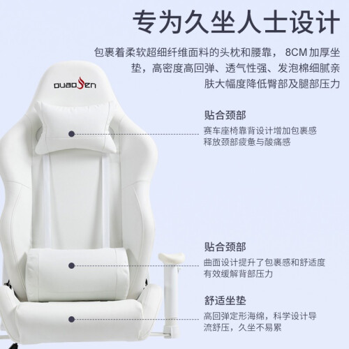包裹着柔软超细纤维面料的头枕和腰靠,8CM加厚坐垫,高密度高回弹、透气性强、发泡棉细腻亲肤大幅度 降低臀部及腿部压力。
