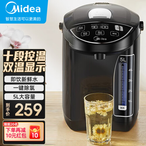 美的(Midea)这款型号为Power 302(MK-SP50)的电热水壶,电水壶容量为5升,支持10段温控,45度-90度可选择。实时温度显示,可见设定温度和当前温度。具有3种烧水模式,烧水后保温、加热到保温温度和只烧开不保温,可根据自己需求选择。新升级触控面板,操作更简便。此外还有除氯再沸腾、安全童锁等功能,给你放心饮水全新体验。
