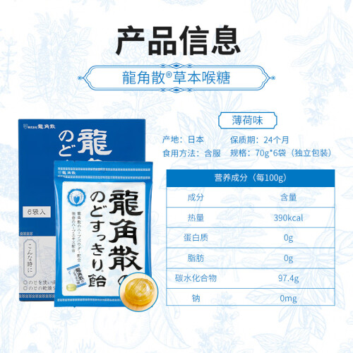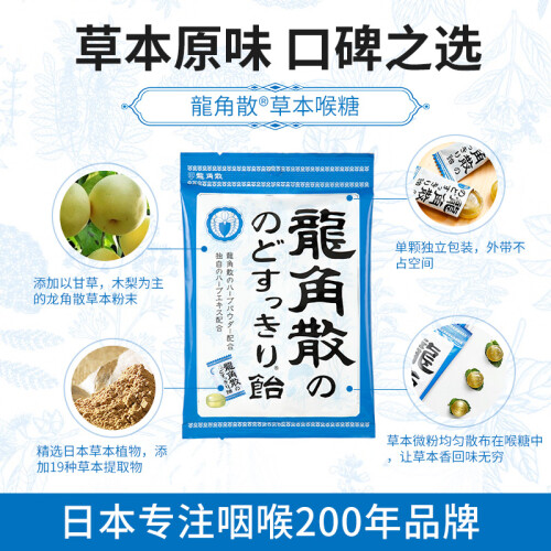 株式会社龙角散成立于1928年,在日本是享誉全国的止咳润喉药品、食品公司,几乎是润喉=龙角散的地步。曾有过调查,日本人的EDC,10人有6人都会装有龙角散的润喉糖。龙角散是一种非常细腻的粉末状中草药,有一定止咳化痰的功效。龙角散一系列糖都很有人气,这款尤其受欢迎,除了龙角散成分,还配合了枇杷叶、母菊、木梨等19种中草药,清清凉凉,最重要的是味道很好,不辣嗓子。