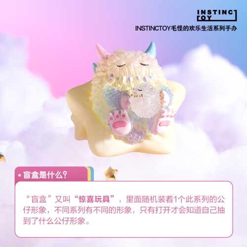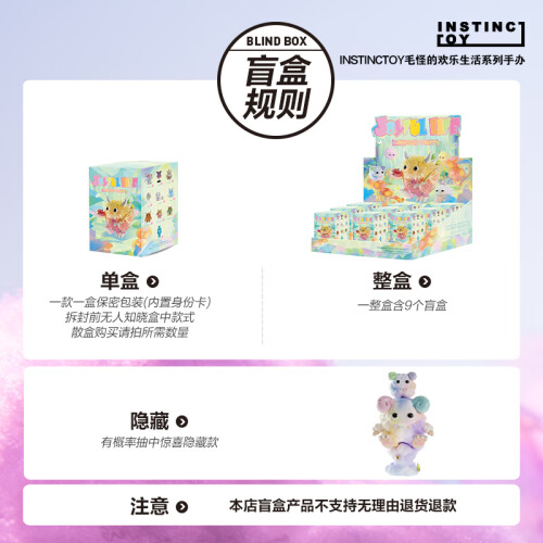 公仔高约7-10cm,系列内9款常规款,1款隐藏款,隐藏款放置在常规款盲盒内,概率为1:108。其中本次含有新玩法:每个公仔手上均拿着象征性的小配件,且公仔内含有夜光设计,内填充闪条,夜晚下每只都呈现不同色彩效果,可与其他公仔进行组合,有趣好玩。
