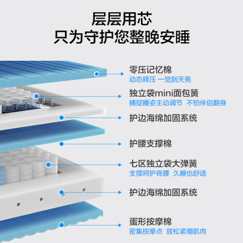 0压感绵+V型空气槽分区支撑层+双层塔式弹簧结构,软贴合+硬支撑,层层组合的材料科学,新科技带来睡眠革新,采用巴斯夫进口原材,德国工艺制成具有更优秀的释压性、承托性与耐用性、开放性微孔结构,压力向四周层层分散,久用不塌。