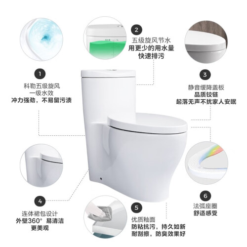科勒此款K-4165T连体式马桶采用五级旋风冲水系统,360度喷射虹吸,环形密布出水孔,超强吸力强力冲,排污更强劲,双冲按键,超短过水道,减少动能消耗,水流速度更快,节水环保。创新喉面孔设计,准确控制水流角度和力度,实现全面清洁。360度桶阀设计,爆破性瞬间流速,冲力强劲。大直径排污管,易于冲走大体积污物。1230度高温煅烧,密度高不易开裂,三层釉面,坚固耐用,法弧形舒适座圈,老少皆宜,缓降盖板,减少噪音使用更长久,光滑釉面,美观易清洁。