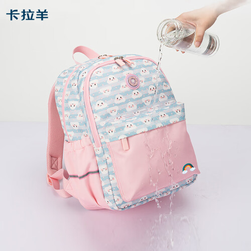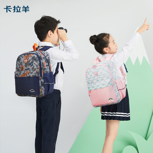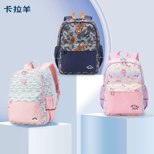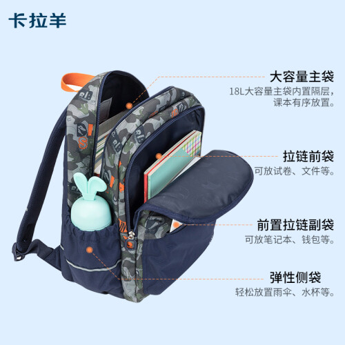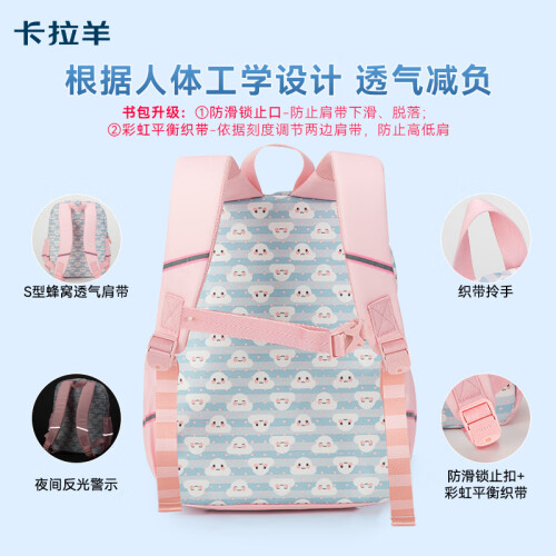 Carany 卡拉羊 小学生减负轻便双肩包 CX2784,皮标贴设计,彰显品质;织带拎手,结实耐用;三角加固设计,经久耐用;双拉头设计,易取物。