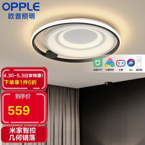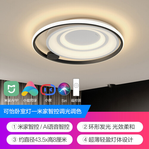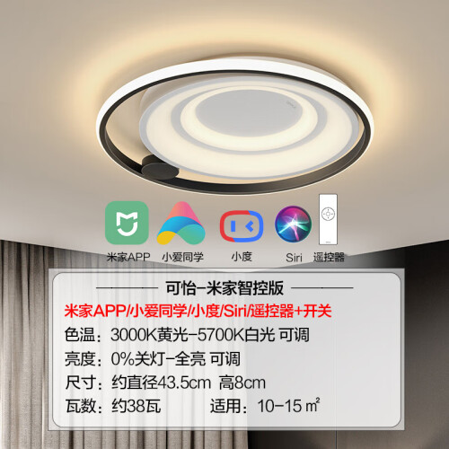 可米家APP、小爱同学、小度/Siri/遥控器+开关进行控制,色温为3000K黄光-5700K白光可调。尺寸:约直径47cm,高11cm,瓦数:约47瓦,适用:12-18平方米空间,米家智控调光调色,米家智能AI语音智控,线面环绕光影丰富,超薄轻盈设计,47瓦大照明明亮光效。