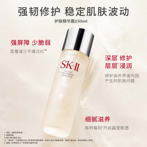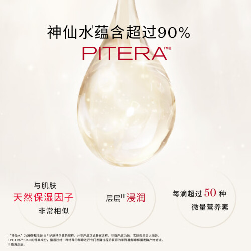SK-II护肤精华露俗称神仙水,是SK-II家的当家花旦,荣获过不少知名美妆大奖。SK-II护肤精华露号称神仙水主要添加有90.7%天然萃取物Pitera™ ,这是一种酵母在发酵过程中提炼出的液体,可渗入真皮层,促进皮肤的新陈代谢,能够一定程度上收缩毛孔,均匀肤色,淡化细纹,提高皮肤的通透度。