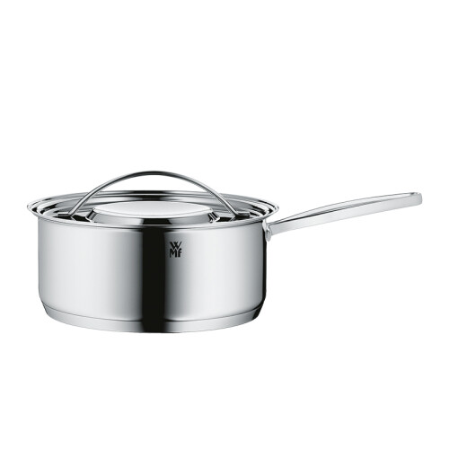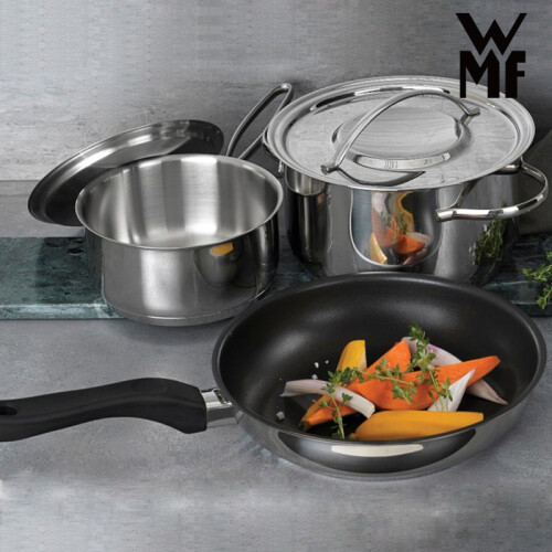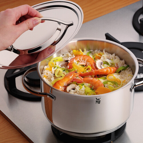 本款使用WMF标志性的使用Cromargan18/10不锈钢材质,拉丁语Crom代铬,Argan代表银色的光泽。其中含18%铬Crom防止生锈、10%镍Nickel抗酸增加光泽,72%不锈钢Stah,具有抗酸碱、耐侵蚀、易清洁、不吸收异味的优点。使用Transthermb通用锅底,适合各种灶具,满足不同烹饪需求。三层钢铝钢(锅体 uromargan不锈钢/锅盘铝层/锅底铬钢)锅底的微凹设计,在受热时底部即充分伸展,呈现受热平面,确保使用时的稳定性及良好的导热性,储热更为持久。无滴漏锅边錄,汤汁倾倒不滴漏。人性化蒸汽孔设计,准确掌控烹饪进度,平盖轻松推移。先进点焊技术,内壁平滑无铆钉,卫生易清洗。