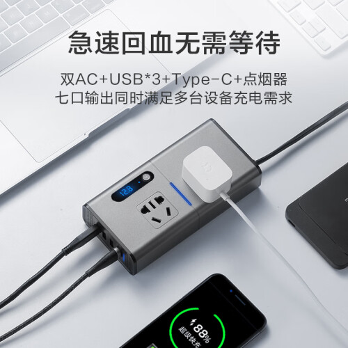独立开关双重防护:平时无电流,使用时,打开开关使用完毕,可以断开电流;新国标双AC口稳定输出:220V交流电,小家电,数码设备适用,随时供电,电量满满。