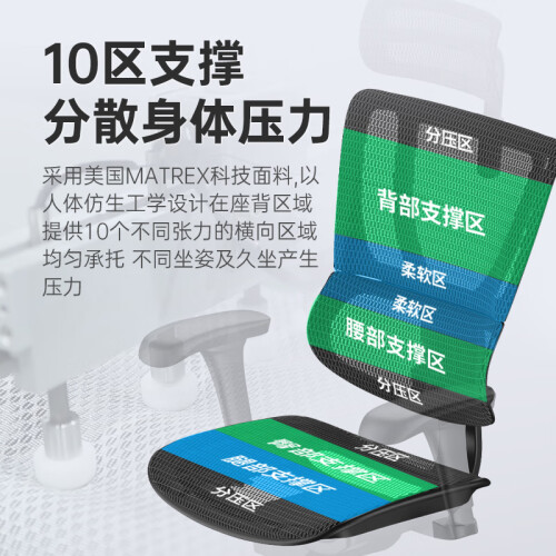 1.8D坐感 10区支撑:座垫分区(4个横向区)主要用于缓解坐骨因为久坐而产生舒适度欠佳的问题,让坐骨保持稳定。椅背分区(6个横向区)主要用于缓解分散脊椎久坐受到的压力。