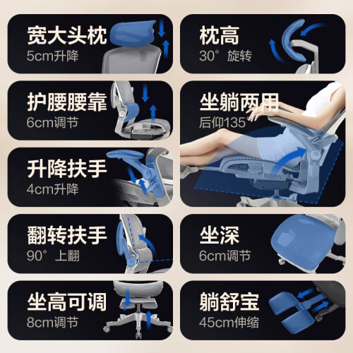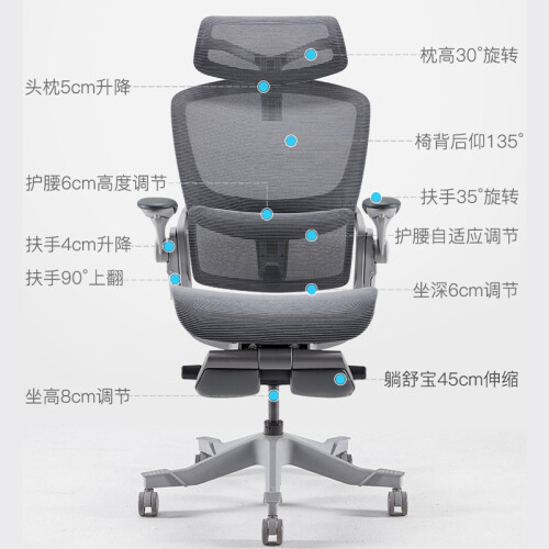 此款4档高度升降调节,6cm高度调节,灵活适应多种身高;自适应腰部运动,后仰时,腰枕曲面变化,腰部始终紧贴不落空;动态捕捉腰高变化,后仰时,腰枕浮动调整,维持舒适的腰部支撑。135°大仰角,星舰流线盘状背撑,仰躺午休,压力瞬间释放,身有依靠,脚有承托,午休告别趴桌睡。4D太空臂式,分体调节扶手,机体部分上下调节,扶手左右调节,轻松适应多种肘部姿势。