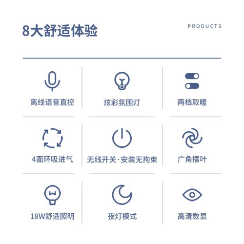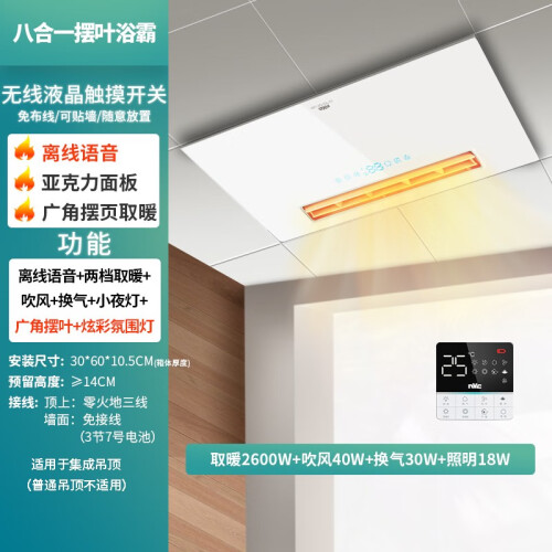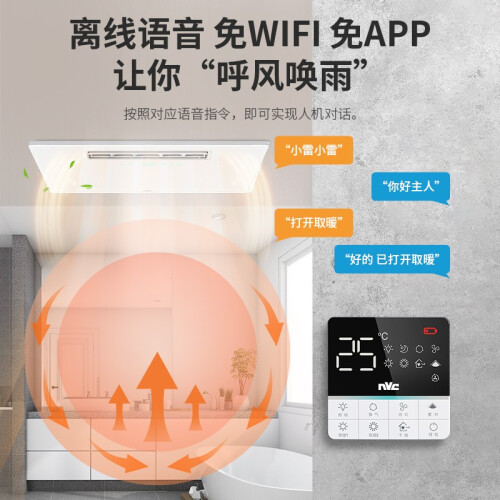 通过“米家”APP、小爱音箱、智控开关均可操作。可以随时随刻开启浴霸,温暖沐浴。2600瓦大功率PTC快速制热,高效率转化热能量,无间隙热传递,强劲供暖,360°往复进出风,风量高达200m3/h,360立体循环加热,整体升温,全域取暖,即使1米以下的孩子也可全身温暖。12W大LED照明面板嵌入,轻松照亮8平米空间。