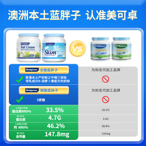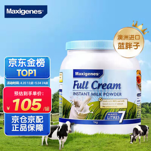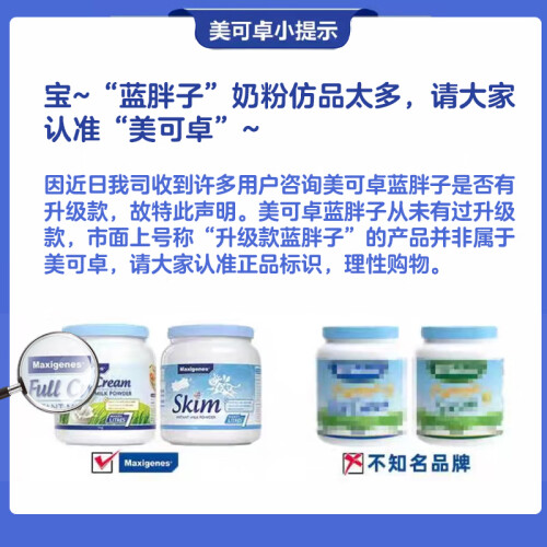 Maxigenes 美可卓全脂高钙奶粉,因为超足量的圆肚子包装,人称“蓝胖子”奶粉。全脂、高钙、易吸收,孕妇、青少年、老人都可食用。添加促进骨骼生长和大脑发育的钙、维生素A和D ,以及大豆卵磷脂配方,利于人体吸收,不添加蔗糖和香精,不含防腐剂和色素,长期饮用不会引起发胖,口味香浓醇厚。规格:1kg。