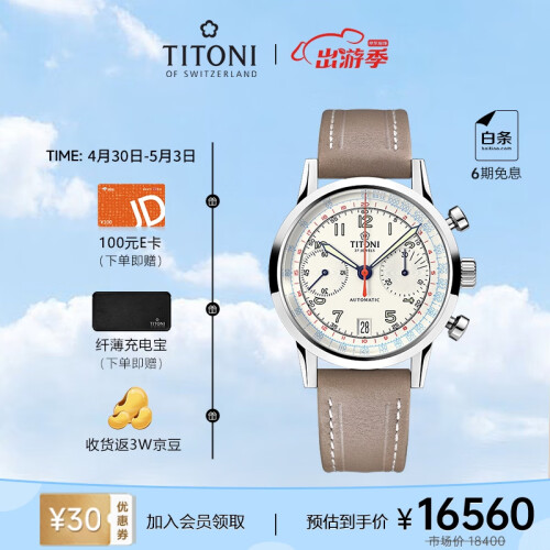 TITONI 梅花 传承系列 男士自动机械表 94019-S-ST-682,潜心雕琢的钟表工艺,锲而不舍的匠之精神,传承瑞士血统、以典雅的外观设计、高品质的取材、一丝不苟的准确性、为您打造真挚时刻,表盘装饰瑞士梅花表早年复古LOGO标志,简洁大气的蓝色宽剑针游走在白色典雅的表盘和显眼的红色时标之上,儒雅经典,计时按钮的设计也采用原版流行的样式,突出固定在表壳外把头携刻复古LOGO标志,这款手表另一个迷人的设计是透明的底盖让计时表华美精致的机芯一览无遗。