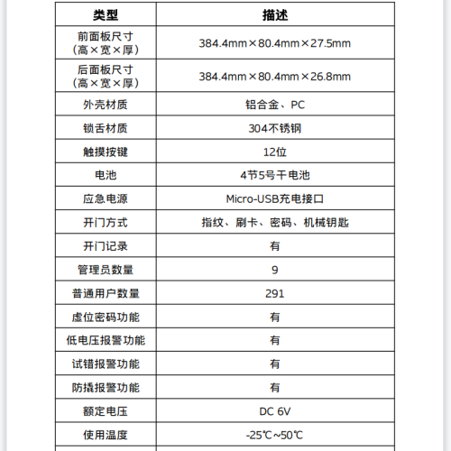 指纹传感器迅速精准地识别指纹,1秒内快速解锁,精准耐用,轻轻一触,即开即入。耐磨损指纹传感器,更大面积,更易识别,防静电设计,避免冬天静电烦恼。可设置多组密码,每位家人均可根据习惯定制属于自己的密码,安全省心。