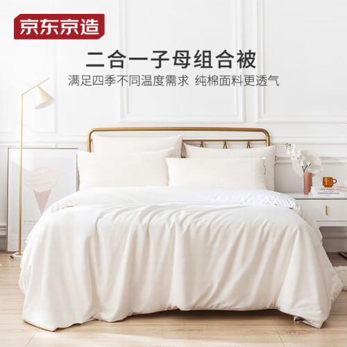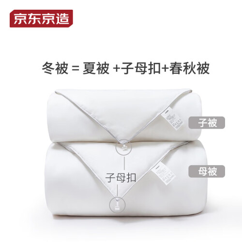 此款100%天然蚕丝,使用贡缎面料柔软亲肤,由两条相同大小、不同厚度的蚕丝被共同组成,可单独作为夏被、春秋被使用,也能通过子母扣组合当作冬被使用满足四季不同温度需求。