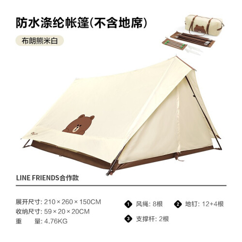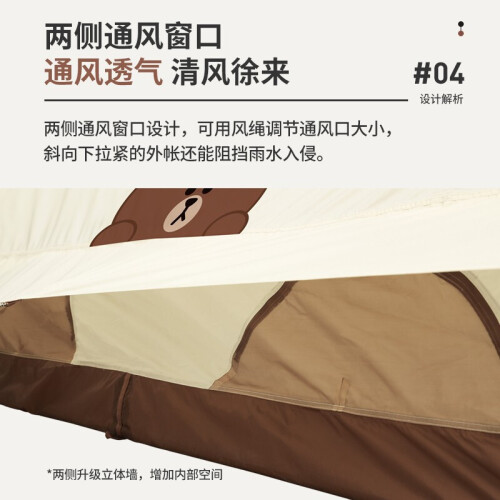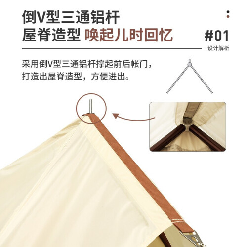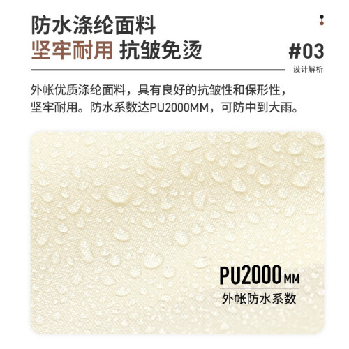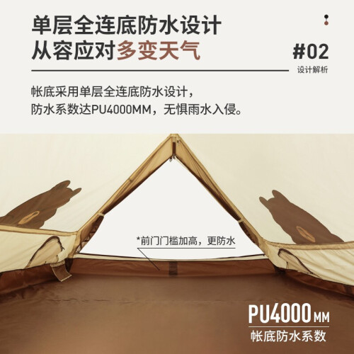 采用倒V型三通铝杆撑起前后帐门,打造出屋脊造型,方便进出。帐底采用单层全连底防水设计,防水系数达PU4000MM,无惧雨水入侵。无需另行购买地布,搭建更省力。外帐优质涤纶面料,具有良好的抗皱性和保形性,坚牢耐用,抗皱免烫。防水系数达PU2000MM,可防中到大雨。两侧通风窗设计,可用风绳调节通风口大小,斜向下拉紧的外帐还能阻挡雨水入侵。帐门采用一层网纱一层布门的双层设计,网纱门透气防蚊,布门防风防雨,贴心满足您的不同需求。