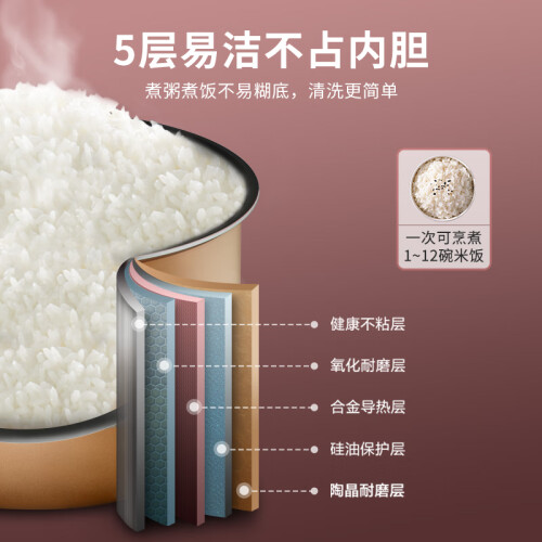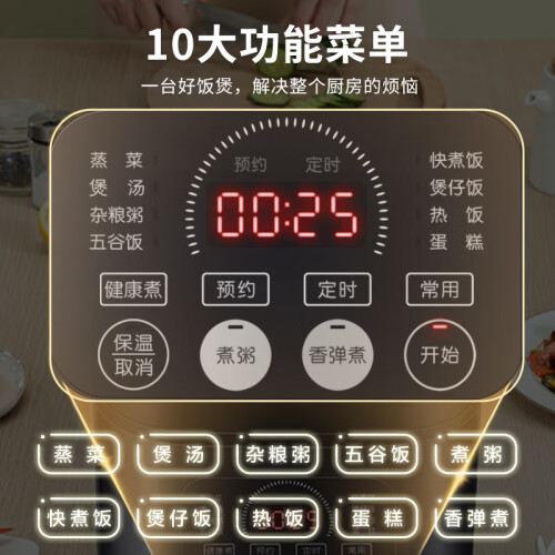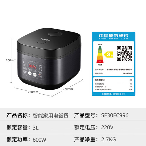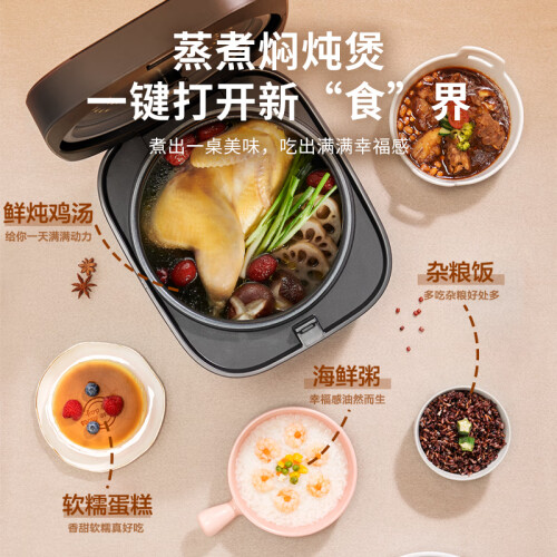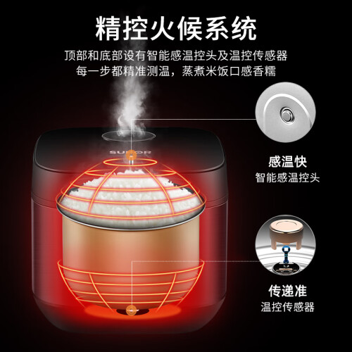 苏泊尔 FC996系列 电饭煲,拥有蒸煮焖炖煲5种烹饪模式,10大功能菜单。特设杂粮粥和五谷饭程序,杂粮烹饪一键搞定。采用5曾聚能耐用内胆,导热更均匀,米饭口感更好。健康不粘内胆,方便清洁不易糊底。600w大功率烹饪,搭配35分钟快煮模式,晚点下班也不耽误吃饭。精控火候系统内置多个温控传感器,实现±1℃精准控温,以及7段精煮曲线。