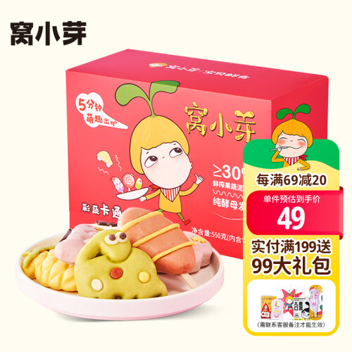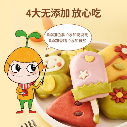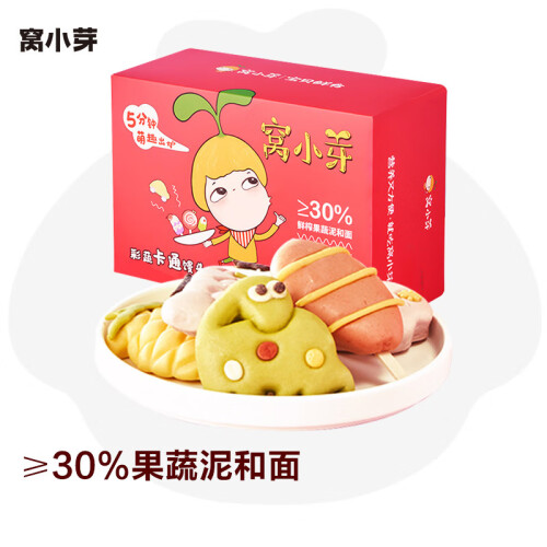窝小芽儿童卡通馒头妙想多礼盒,每款搭配卡通造型,寓教于吃和宝宝一起互动,好吃又有趣。严格执行GB19295速冻面米食品标准, 精选优质小麦粉,纯酵母和面,手工捏型,口感松软,更易消化。3大无添加,无人工香精、色素和防腐剂,宝宝放心吃。所有颜色来自于果蔬泥调色,果蔬泥含量≥30%,营养健康,富含多种维生素。无需冷冻,轻松烹饪,大火蒸制5分钟即可食用。