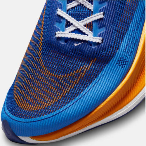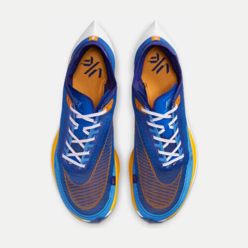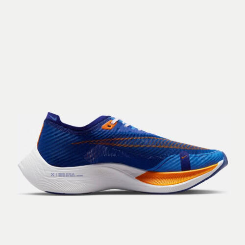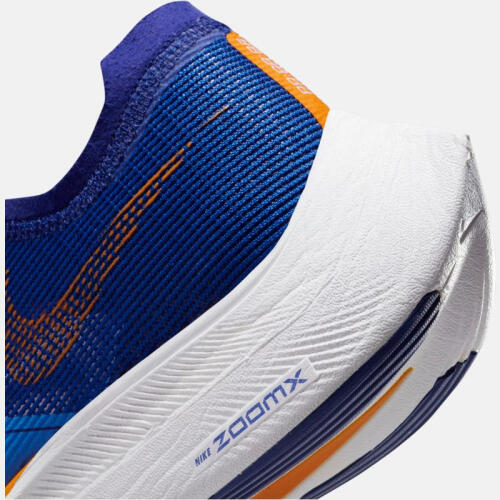 二代 Zoomx Vaporfly Next%依旧是ZoomX泡棉+全掌铲型碳板、外底前掌耐磨橡胶、后掌两根耐磨条配置,但是革新的编织鞋面,蒂芙尼蓝的配色。2代的Vaporfly NEXT%改为了编织面料比1代舒适性增加了不少。鞋头部位相较加宽,使得鞋子在穿着舒适度上会提升一些。鞋头新增防撞设计的作用一个是减少脚趾擦伤或碰撞。在鞋身侧面进行了支撑补强,以提升鞋子的整体强度,延缓寿命。鞋带用 Alphafly NEXT%类似设计,扁平式的鞋带设计可以避免鞋带散开,提升跑步体验。