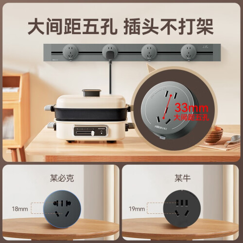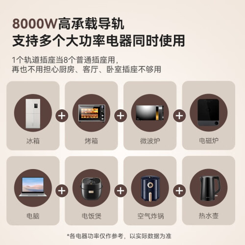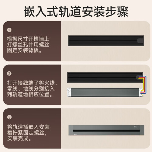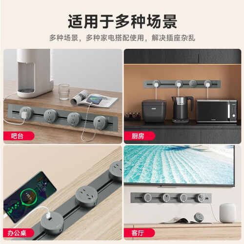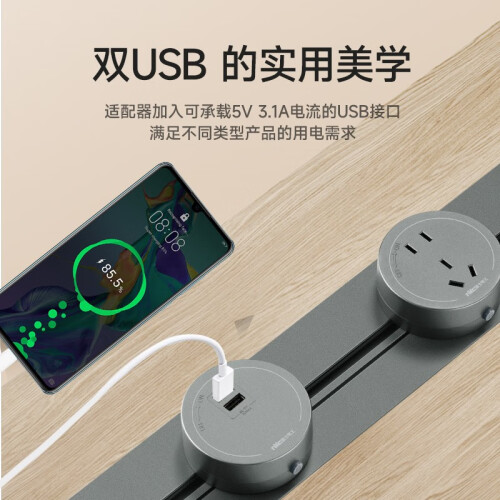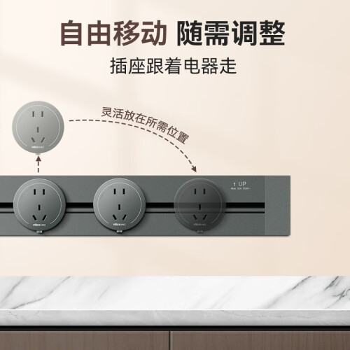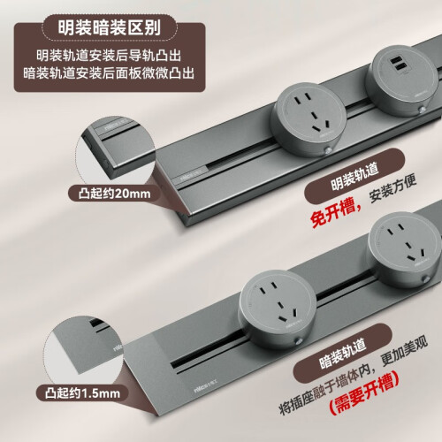 嵌入式安装,将插座融于墙体内,贴近墙面凸起仅1.5mm的厚度。 适配器可按需添加,灵活调节位置,与品牌明装轨道插座通用。 右转通电,左转断电,通断操作安全又轻松。 内置安全保护门,单极防误插设计,防止儿童玩耍插入触电,用电安全有保障。 主体采用铝合金材质,通过阳极氧化工艺,提升耐用度与整体美观性。 大孔间距设计的适配器,能满足二三插同时使用的需求。